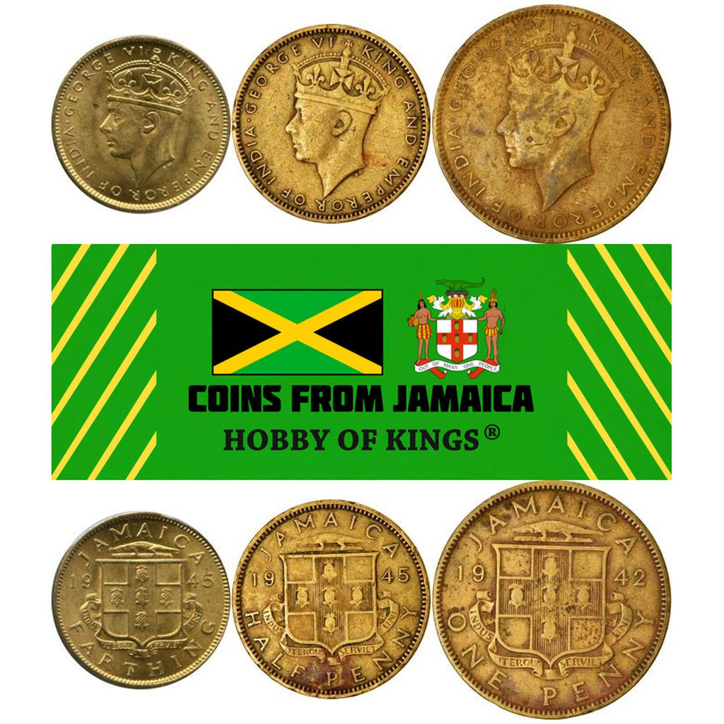 النقش العكسي: جامايكا فارثينغ 1945 Indus Uterque Serviet Uni، جامايكا نصف بنس 1940 Indus Uterque Serviet Uni، جامايكا بنس واحد 1942 Indus Uterque Serviet Uni