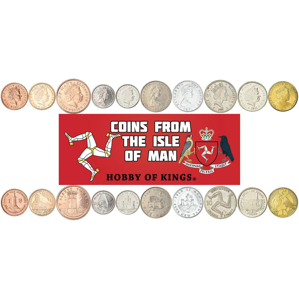 عملات مختلطة من جزيرة مان (إيلان فانين، مانين). تم اختيار عملات مانكس مختلفة عشوائياً من هذه الفترات: الملكة إليزابيث الثانية 1970 - 2022 ().