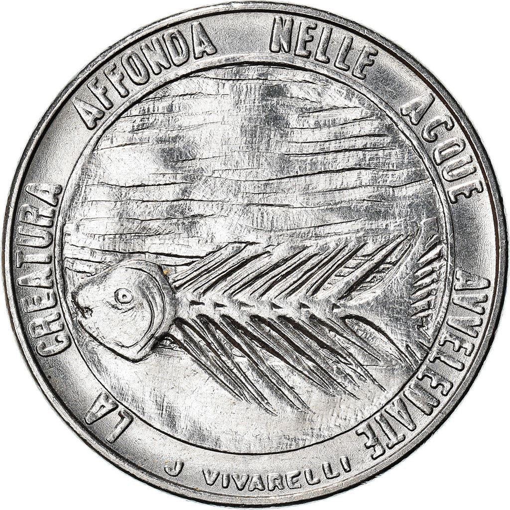 Omvendt: Fiskeserie: Beskyttelse af naturen Forside De tre tårne i San Marino, kronet med de tre fjer. Pålydende værdi nedenunder. Legende med dato rundt om.