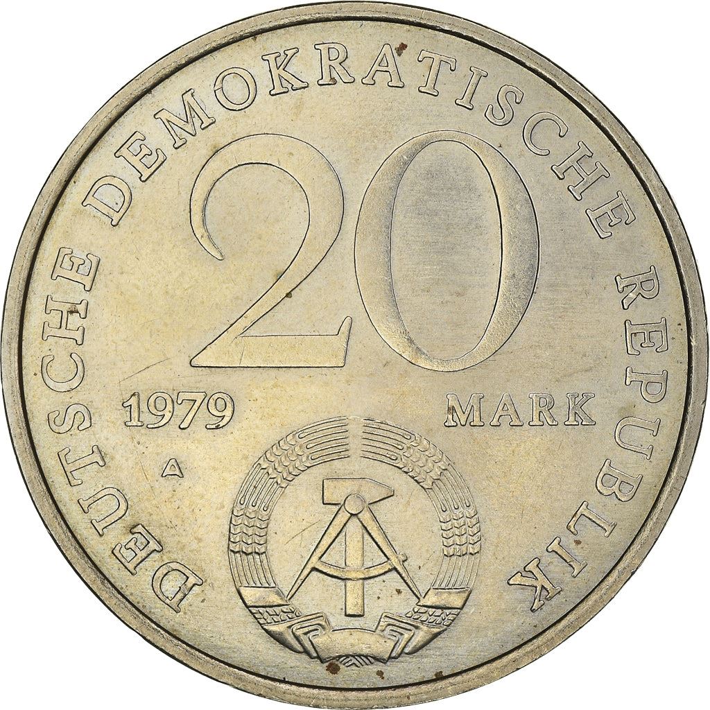 20 Mark mønt fra Tyske Demokratiske Republik (Tyskland, Deutsche Demokratische Republik). Mønten blev cirkuleret i 1979 og vil blive udvalgt tilfældigt. Forskellige grader fra God til Meget fin. Et foto er kun til reklameformål. Mønten kan have ridser, snavs eller skader fra oxidation.