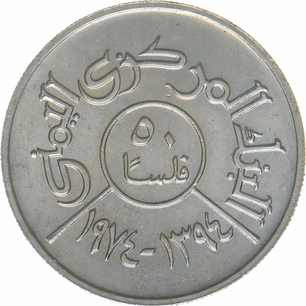50 Fils coin from North Yemen (Yemen Arab Republic, Yemen). The coin was circulated in 1974 and will be picked randomly. Various grades from Good to Very fine. A photo is for advertising purposes only. The coin may have scratches, dirt, or damage from oxidation.