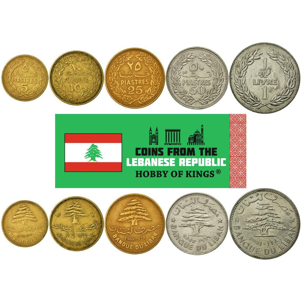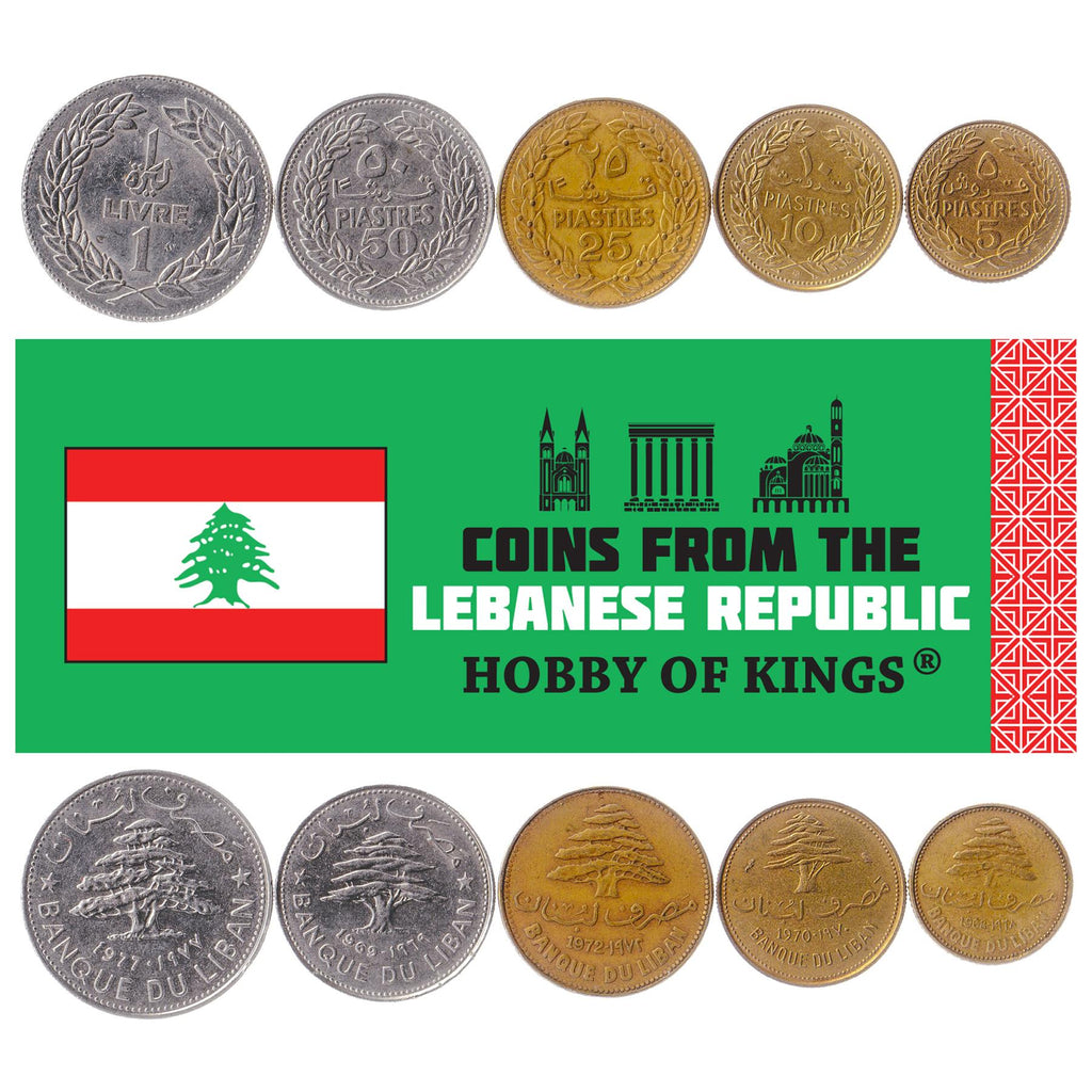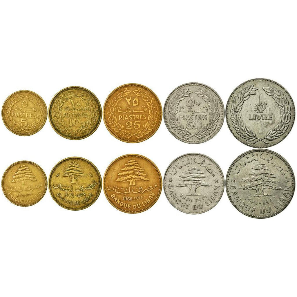 5 coin set made in these countries: Lebanon (الجمهورية اللبنانية), ٱلْجُمْهُورِيَّةُ ٱللُّبْنَانِيَّةُ.