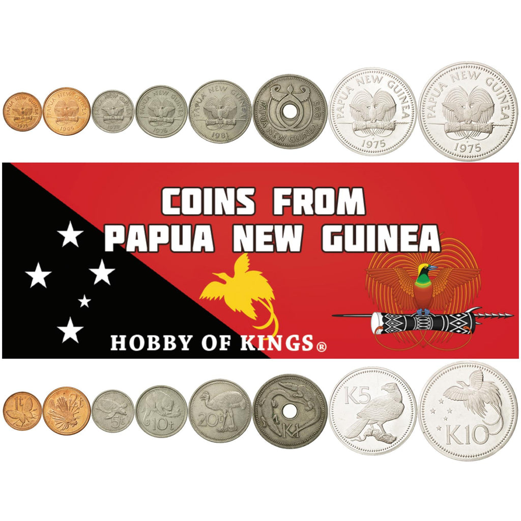 1, 2, 5, 10, 20 Toea 1, 5, 10 Kina coin from Papua New Guinea (Independent State of Papua New Guinea, Independen Stet bilong Papua Niugini). The coin was circulated in 1975 - 2001 and will be picked randomly. Various grades from Good to Very fine. A photo is for advertising purposes only. The coin may have scratches, dirt, or damage from oxidation.