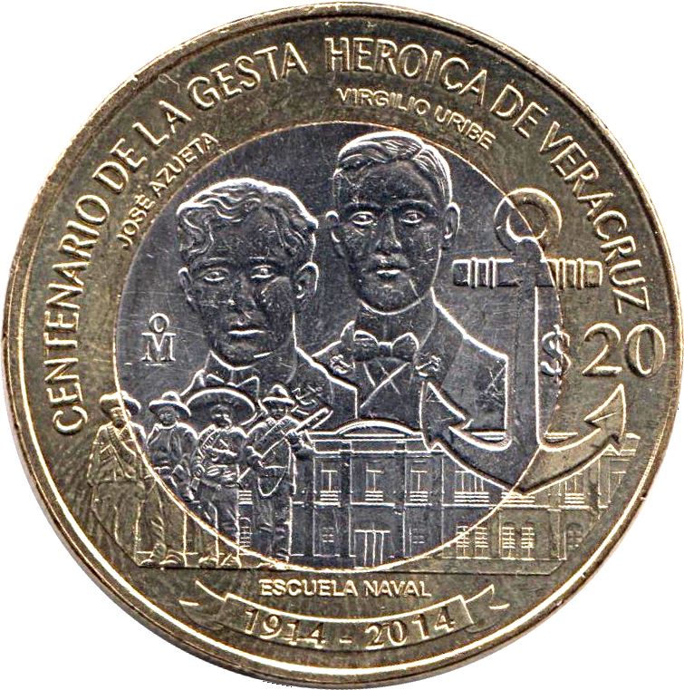 מטבע 20 פזו ממקסיקו (מדינות מקסיקו המאוחדות, Estados Unidos Mexicanos). המטבע הופץ בשנת 2014 וייבחר באקראי. דרגות שונות מטוב ועד טוב מאוד. התמונה למטרות פרסום בלבד. המטבע עשוי להכיל שריטות, לכלוך או נזק מחמצון.