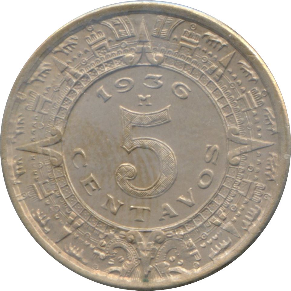 מטבע 5 סנטאבו ממקסיקו (המדינות המאוחדות של מקסיקו, Estados Unidos Mexicanos). המטבע הופץ בין השנים 1936 - 1942 וייבחר באקראי. דרגות שונות מ"טוב" ועד "טוב מאוד". התמונה למטרות פרסום בלבד. המטבע עשוי להכיל שריטות, לכלוך או נזק מחמצון.