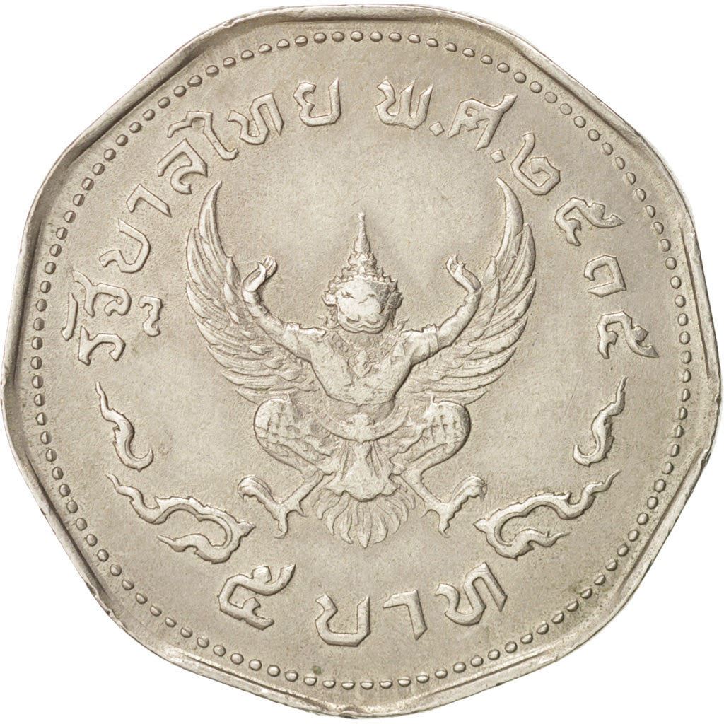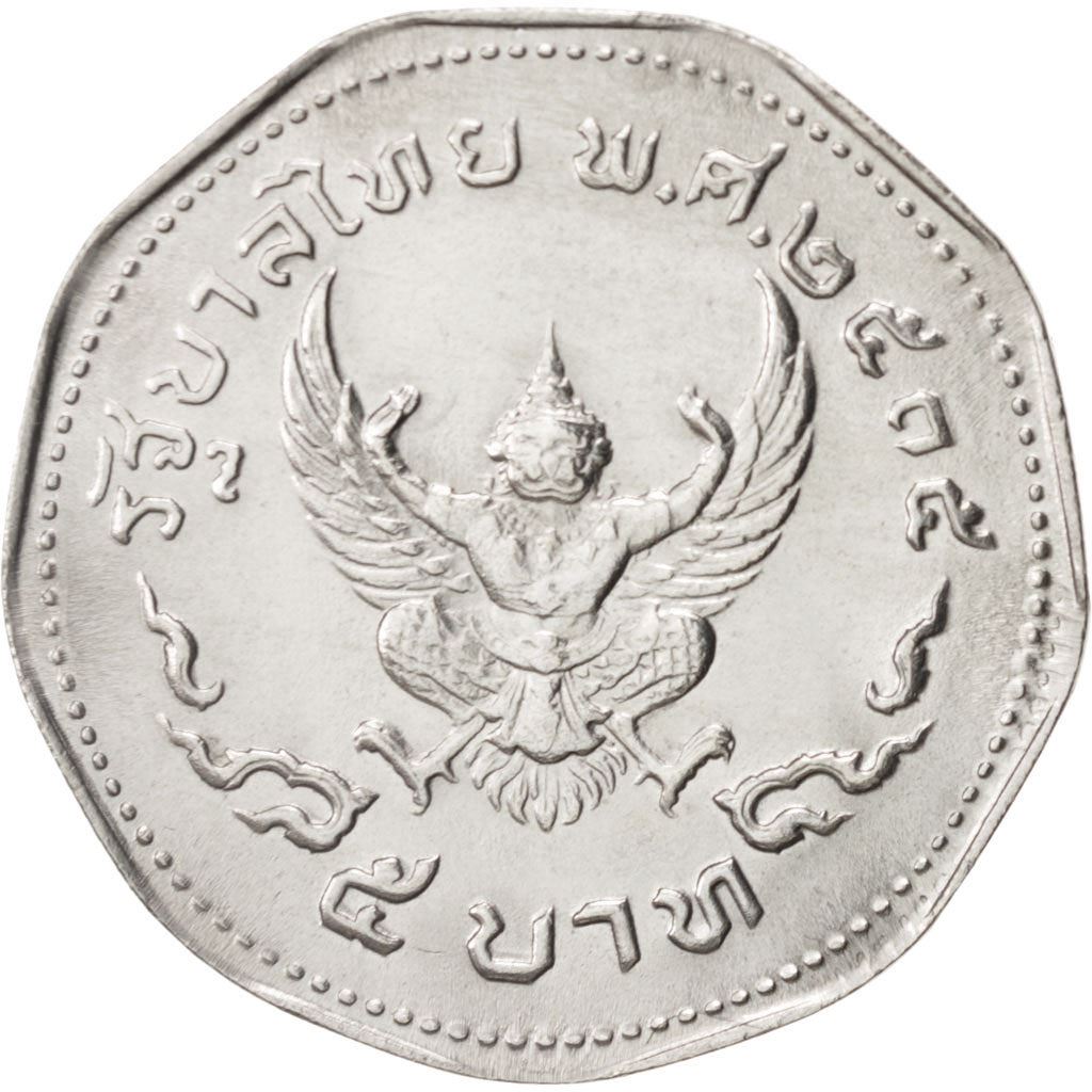 מטבע 5 באט מתאילנד (ממלכת תאילנד, רטצ'ה-אנאצ'אק). המטבע הונפק בשנת 1972 וייבחר באקראי. דרגות שונות מטוב ועד טוב מאוד. התמונה למטרות פרסום בלבד. המטבע עשוי להכיל שריטות, לכלוך או נזק מחמצון.