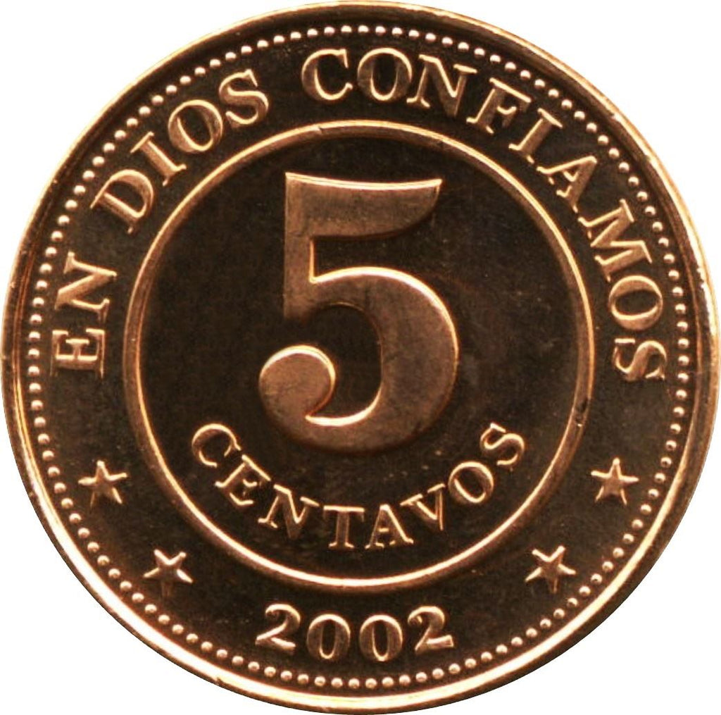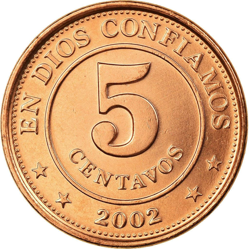 מטבע 5 סנטאבו מניקרגואה (República de Nicaragua, Republic of Nicaragua). המטבע הונפק בשנת 2002 וייבחר באקראי. דרגות שונות מטוב ועד טוב מאוד. התמונה למטרות פרסום בלבד. המטבע עלול להכיל שריטות, לכלוך או נזק מחמצון.