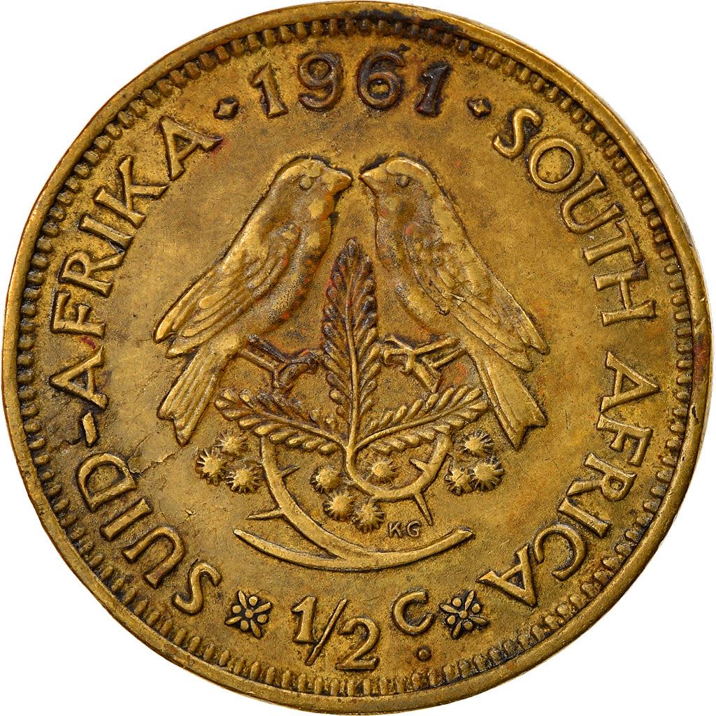 南アフリカ(南アフリカ共和国、Republiek van Suid-Afrika)の1/2セント硬貨。1961年から1964年に流通し、ランダムに選ばれます。状態はグッドからベリーファインまで様々です。写真は広告目的のみです。硬貨には傷、汚れ、または酸化による損傷がある場合があります。