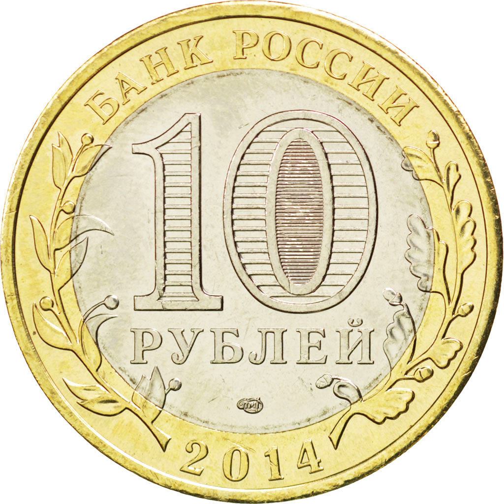 表面: コインの上部の縁に沿って「Банк России」(ロシア銀行)の刻印があり、下部には発行年「2014」が刻まれています。コインの外周の左側と右側にはそれぞれ月桂樹とオークの枝のスタイライズされた図柄があり、円盤にかかっています。円盤の中央には「10 Рублей」(10ルーブル)という額面が2行で表示されています。「0」の中には「10」の数字と「Руб」(ルーブル)の文字が角度を変えると見える保護要素として入っています。円盤の下部には造幣局の商標があります。