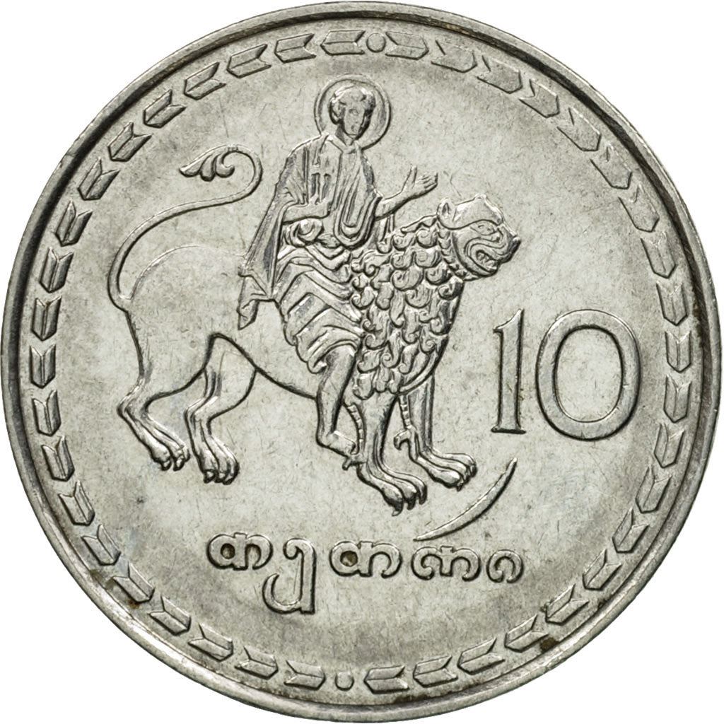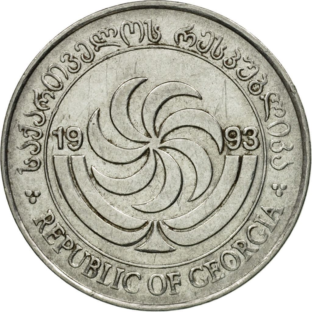 10 Tetri moneta iš Gruzijos (საქართველო, Sakartvelo). Moneta buvo apyvartoje 1993 metais ir bus parinkta atsitiktinai. Įvairūs būklės laipsniai nuo Geros iki Labai geros. Nuotrauka skirta tik reklamos tikslais. Monetoje gali būti įbrėžimų, nešvarumų ar oksidacijos pažeidimų.