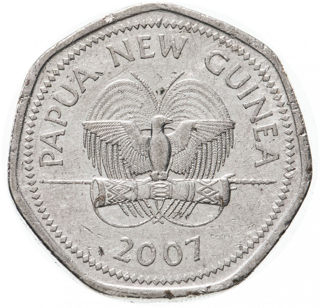 50 Toea moneta iš Papua Naujosios Gvinėjos (Nepriklausoma Papua Naujosios Gvinėjos valstybė, Independen Stet bilong Papua Niugini). Moneta buvo apyvartoje 2007 metais ir bus atrinkta atsitiktinai. Įvairūs būklės laipsniai nuo Geros iki Labai geros. Nuotrauka skirta tik reklamos tikslams. Moneta gali turėti įbrėžimų, nešvarumų ar oksidacijos pažeidimų.