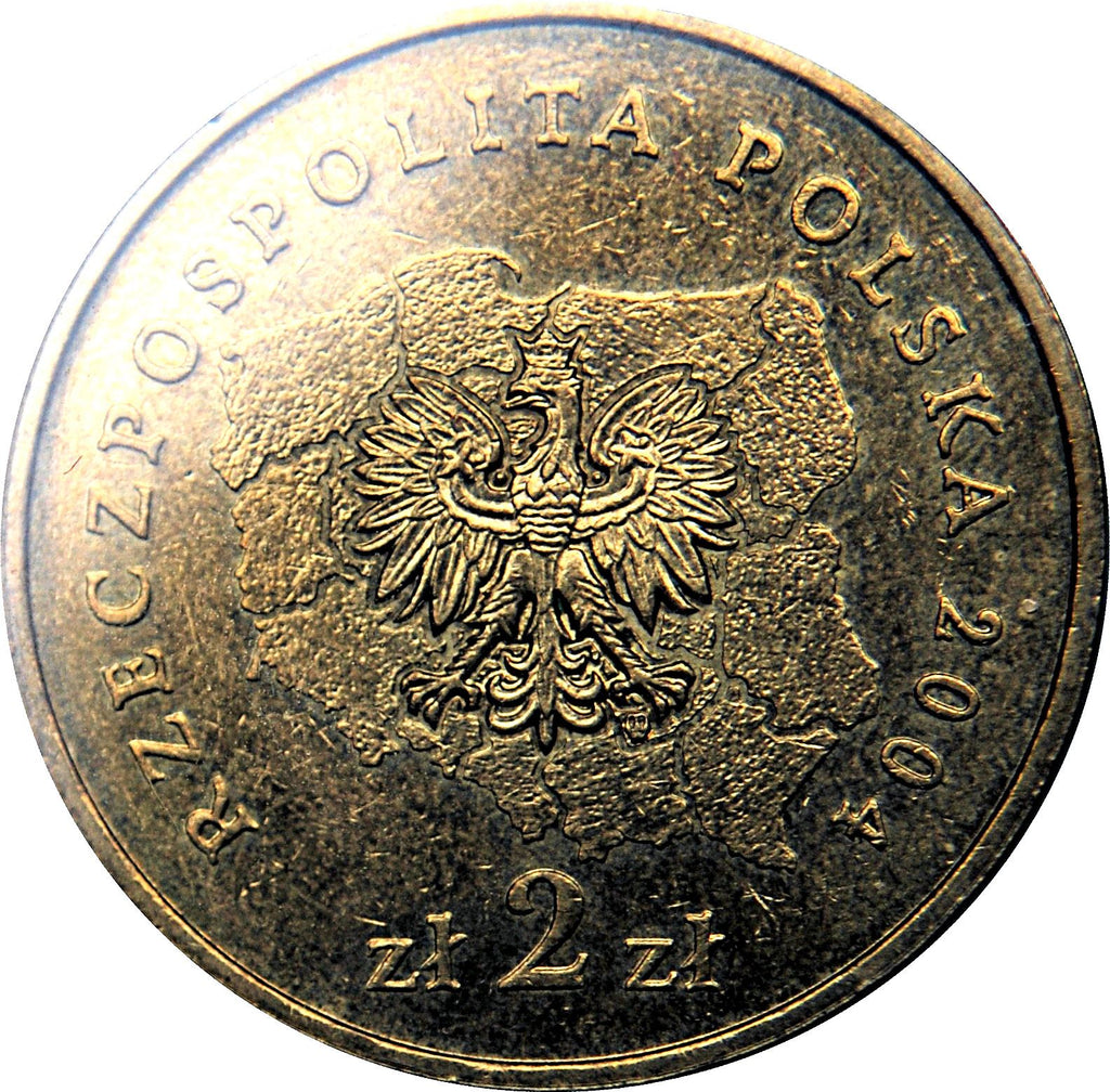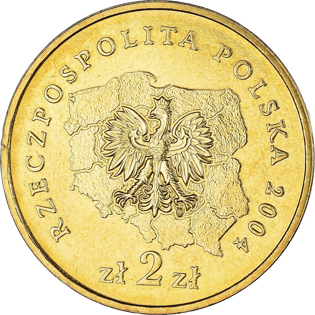 2 Złotų moneta iš Lenkijos (Lenkijos Respublika, Rzeczpospolita Polska). Moneta buvo apyvartoje 2004 metais ir bus parinkta atsitiktinai. Įvairūs būklės laipsniai nuo Geros iki Labai geros. Nuotrauka skirta tik reklamos tikslais. Monetoje gali būti įbrėžimų, nešvarumų ar oksidacijos pažeidimų.