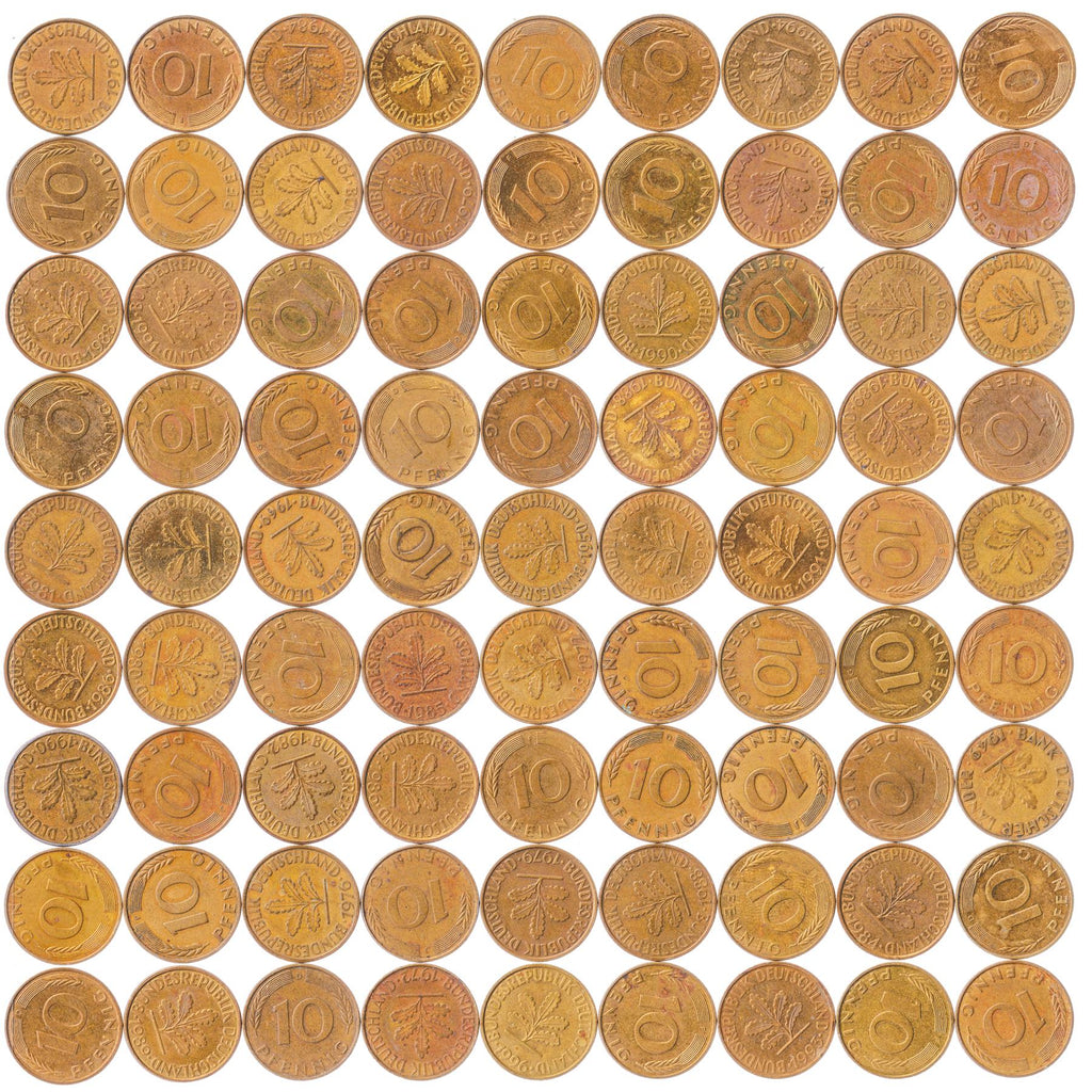 100 mišrių monetų iš Vokietijos (Vokietijos Federacinė Respublika, Bundesrepublik Deutschland). Skirtingos Vokietijos monetos buvo atsitiktinai parinktos iš šių laikotarpių: Vokietijos markė (1948 - 2001) (1950 - 2001).