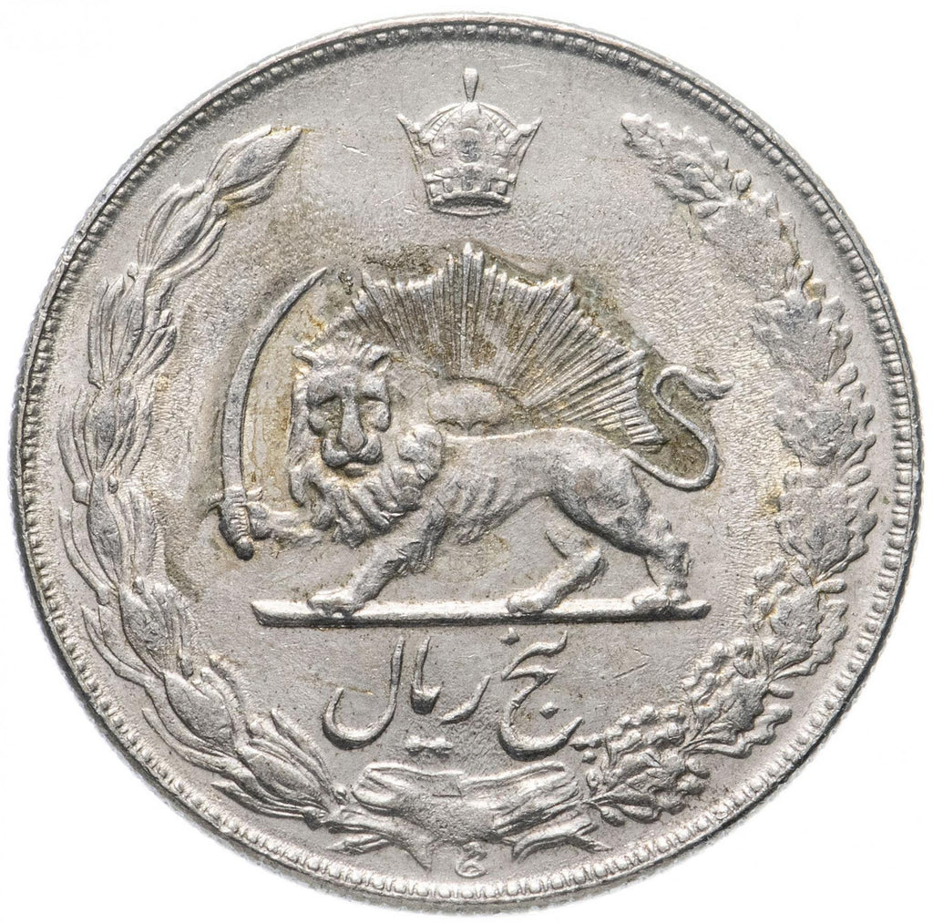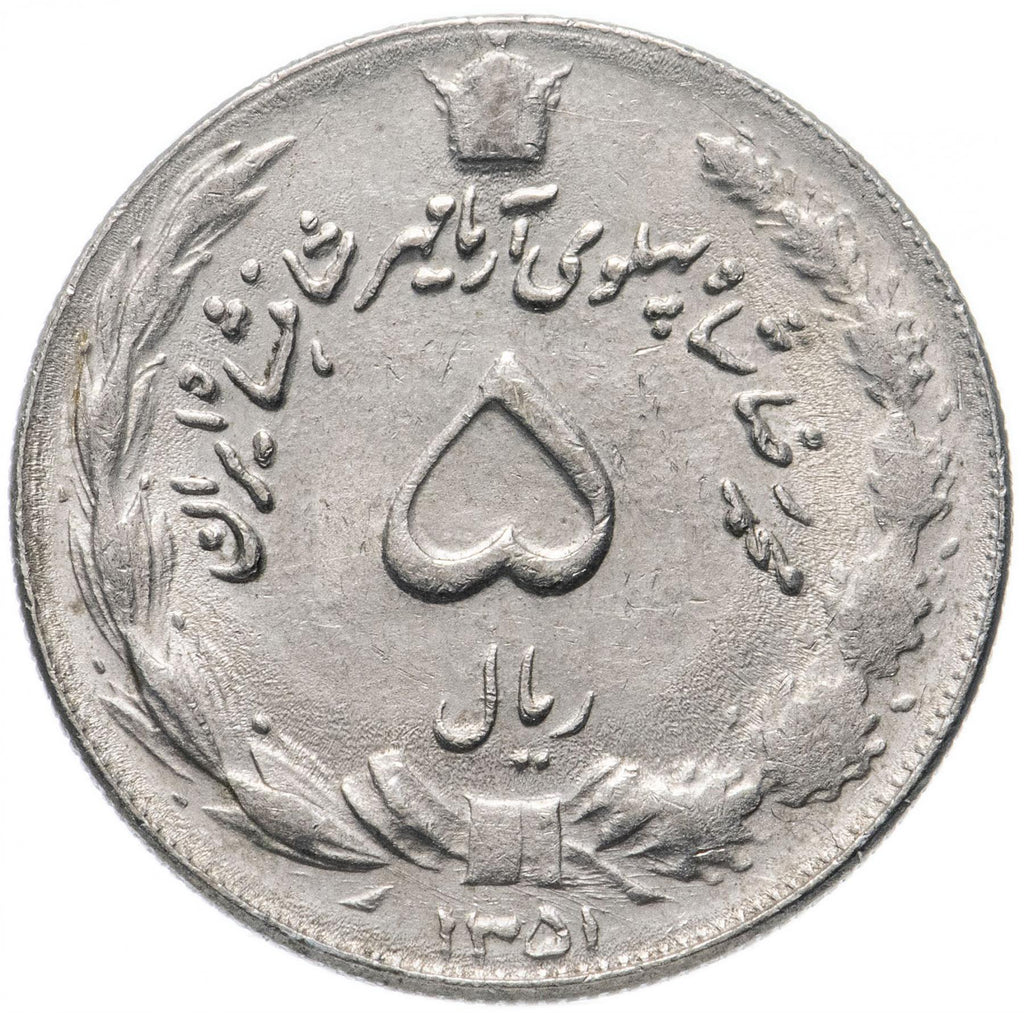 5 Rialių moneta iš Irano (Irano Islamo Respublika, جمهوری اسلامی ایران). Moneta buvo apyvartoje 1968 - 1978 metais ir bus parinkta atsitiktinai. Įvairūs būklės laipsniai nuo Geros iki Labai geros. Nuotrauka skirta tik reklamos tikslams. Moneta gali turėti įbrėžimų, nešvarumų ar oksidacijos pažeidimų.