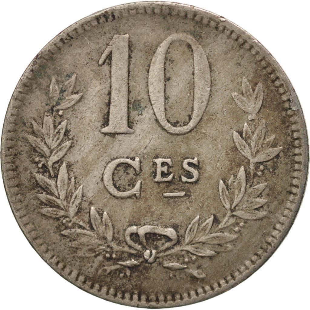 10 centimes mynt fra Luxembourg (Groussherzogtum Lëtzebuerg, Groussherzogtum Lëtzebuerg). Mynten ble satt i omløp i 1924 og velges tilfeldig. Ulike kvaliteter fra god til meget fin. Bildet er kun til reklameformål. Mynten kan ha riper, smuss eller skade fra oksidasjon.