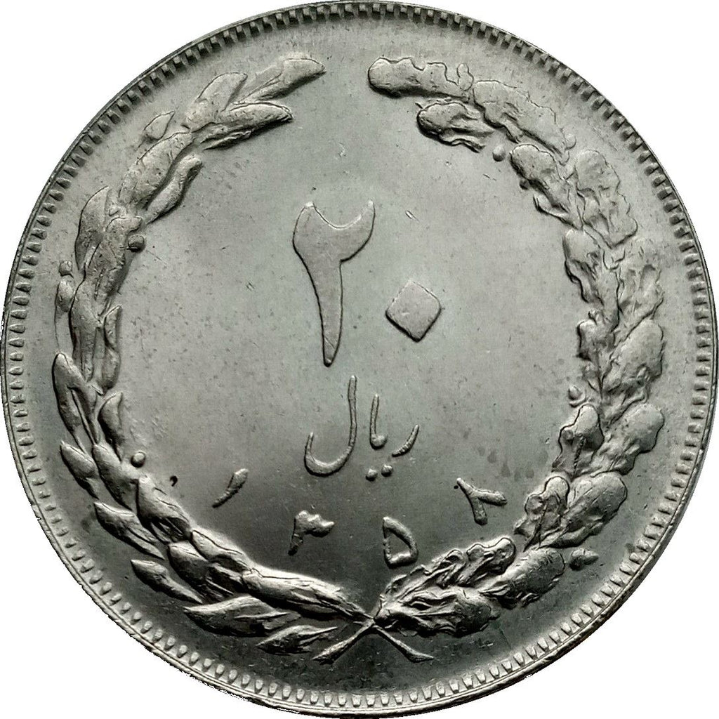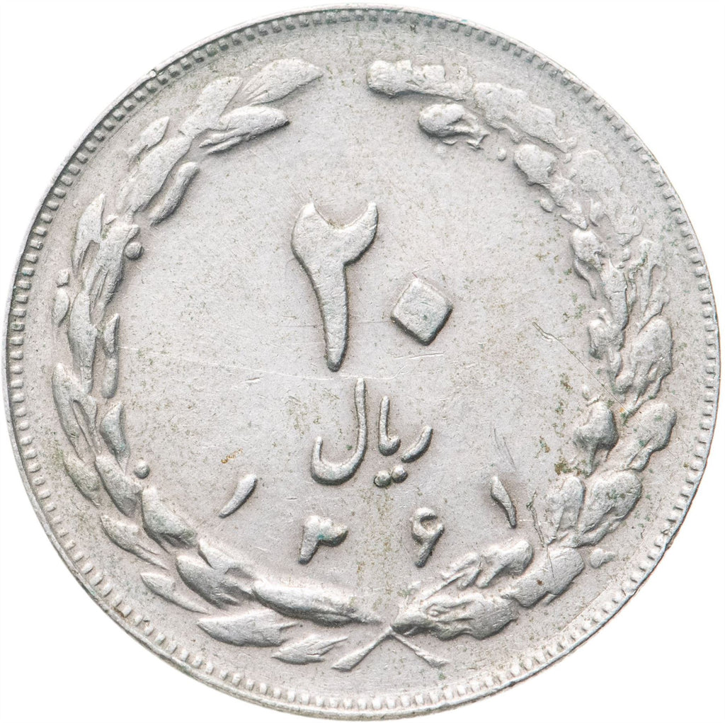 20 Rial mynt fra Iran (Den islamske republikken Iran, جمهوری اسلامی ایران). Mynten var i omløp fra 1979 - 1988 og vil bli valgt tilfeldig. Ulike grader fra God til Meget fin. Et bilde er kun for reklameformål. Mynten kan ha riper, smuss eller skade fra oksidasjon.