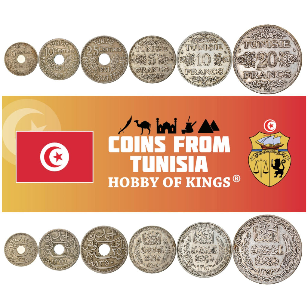 Zestaw 6 monet wyprodukowanych w tych krajach: Tunezja (al-Jumhūrīyah at-Tūnisīyah), الجمهورية التونسية.