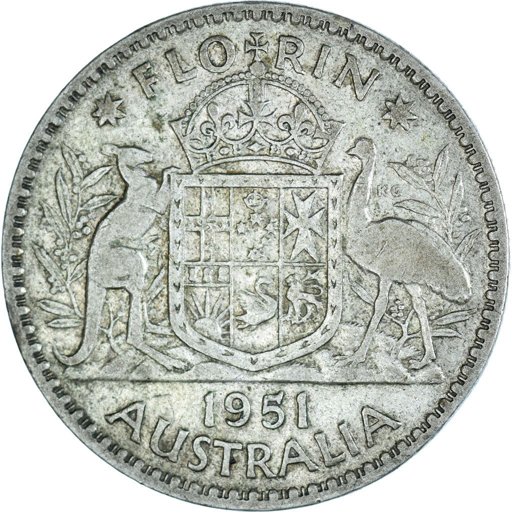 1 Florin coin from Australia (Commonwealth of Australia). The coin was circulated in 1951 - 1952 and will be picked randomly. Various grades from Good to Very fine. A photo is for advertising purposes only. The coin may have scratches, dirt, or damage from oxidation.