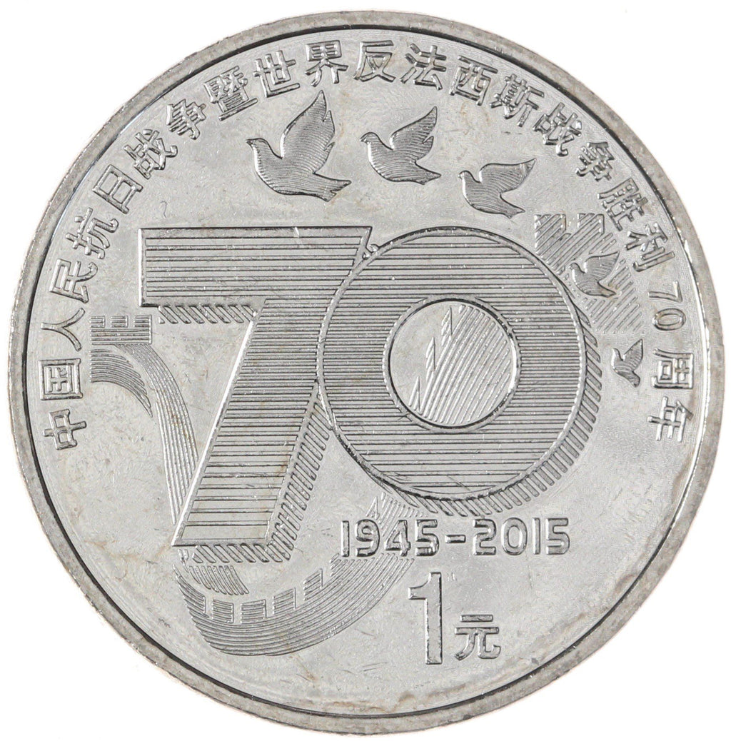 Reverse lettering: 中国人民抗日战争暨世界反法西斯战争胜利70周年701945-20151 元