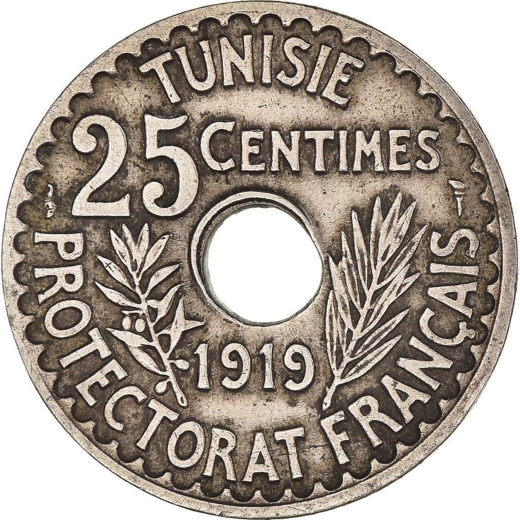 25 Centimes coin from Tunisia (al-Jumhūrīyah at-Tūnisīyah, الجمهورية التونسية). The coin was circulated in 1918 - 1920 and will be picked randomly. Various grades from Good to Very fine. A photo is for advertising purposes only. The coin may have scratches, dirt, or damage from oxidation.