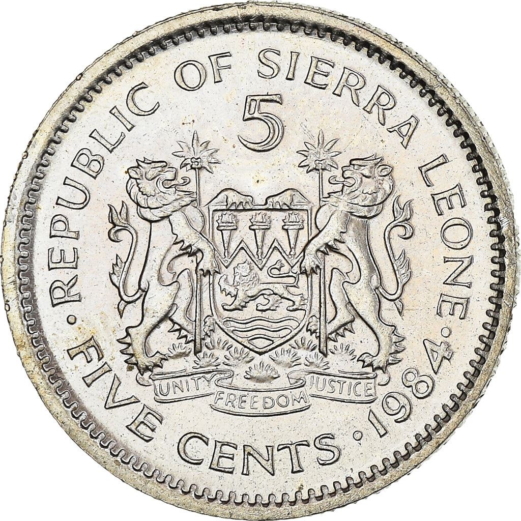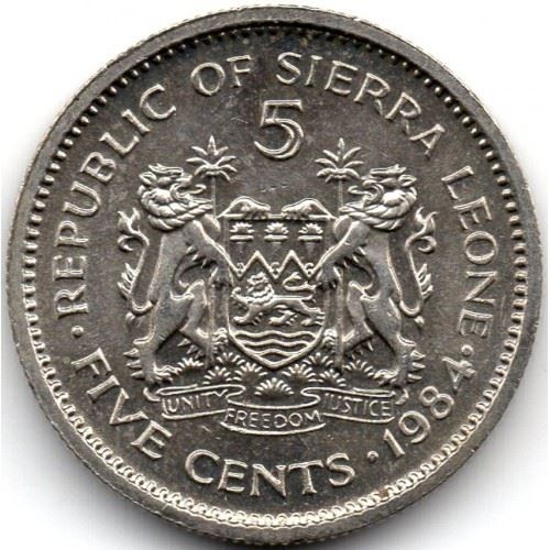 Обратная надпись: РЕСПУБЛИКА СЬЕРРА-ЛЕОНЕ 5 ПЯТЬ ЦЕНТОВ ЕДИНСТВО СВОБОДА СПРАВЕДЛИВОСТЬ 1984