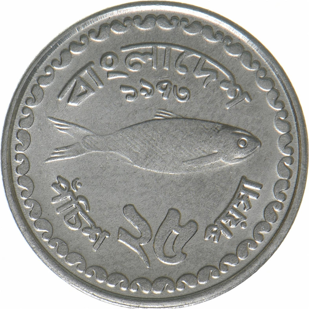 25 Poisha-mynt från Bangladesh (গণপ্রজাতন্ত্রী বাংলাদেশ, Gôṇôprôjātôntrī Bāṅlādēś). Myntet cirkulerades 1973 och väljs slumpmässigt. Olika grader från Bra till Mycket fint. Ett foto är endast för reklamändamål. Myntet kan ha repor, smuts eller skador från oxidation.