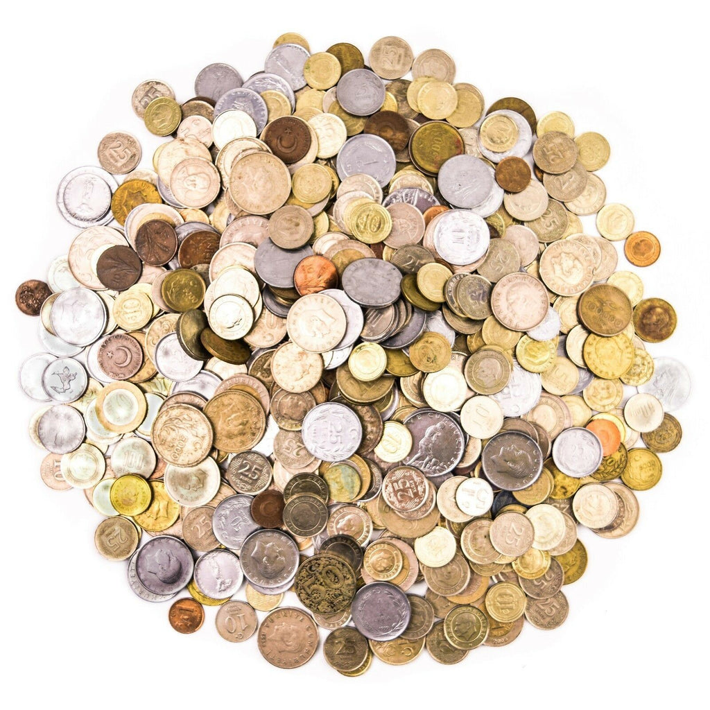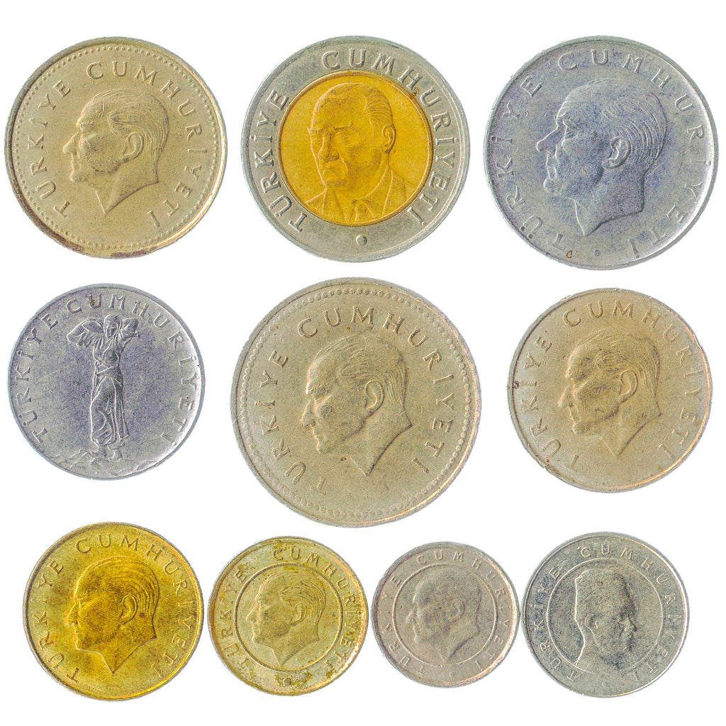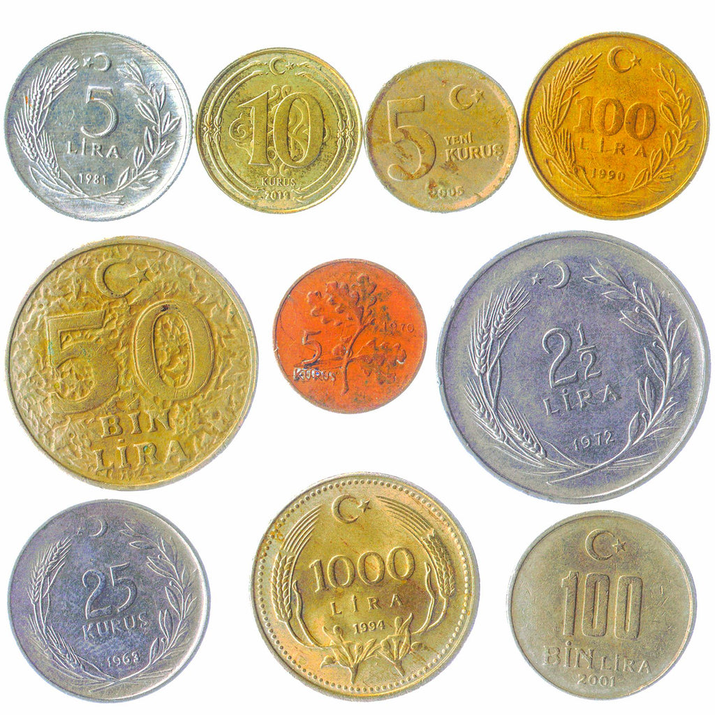 来自土耳其的10枚混合硬币(土耳其共和国,Türkiye Cumhuriyeti)。随机挑选自以下时期的不同土耳其硬币:旧里拉,新里拉(1961 - 2022)。